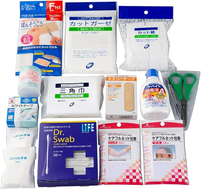外傷の最初の対応は止血と感染予防です。このセットが揃っていれば、多くの小さなケガに対応できます。